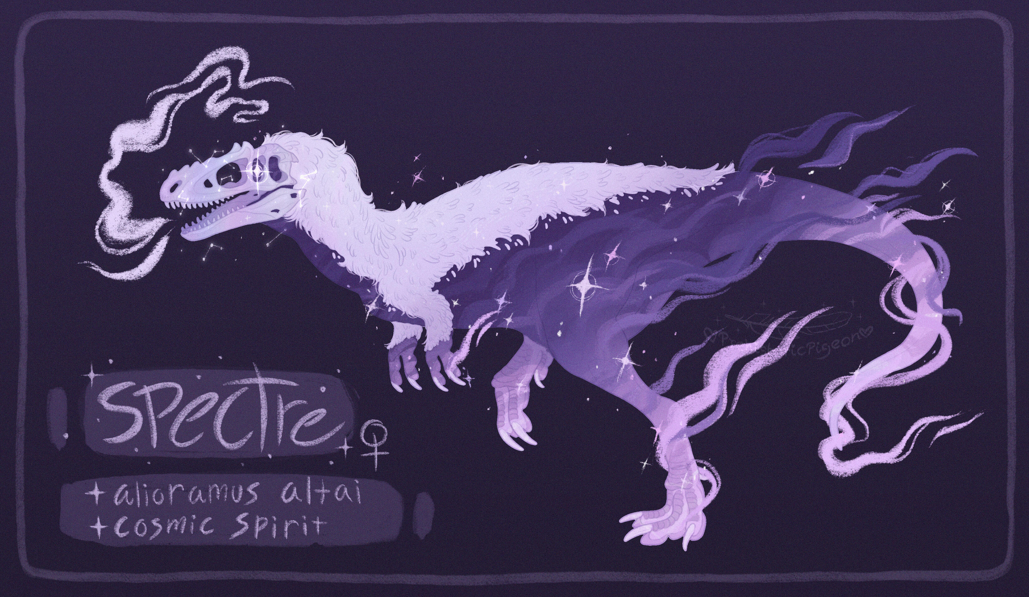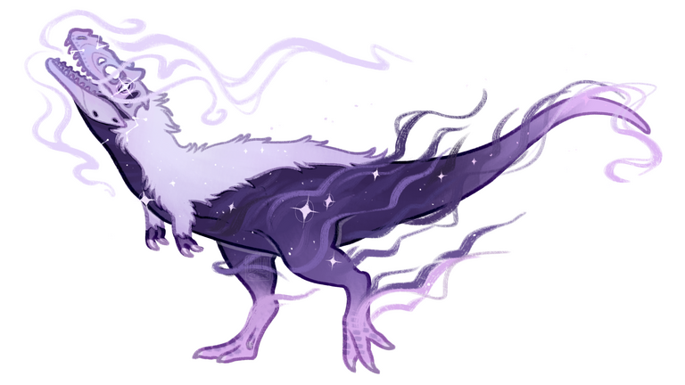 Spectre was a young alioramus that was struck directly in the head by a falling meteor fragment, near the beginning of the Cretaceous–Paleogene extinction event. They died slowly and painfully, and over the next three days while her spirit hovered near the earth still, they witnessed the horrific death and destruction of the Chicxulub impact. They felt great pain and grief watching the devastation, and instead of their spirit passing on into peaceful silence she remained tethered to the earth, becoming a guide for the souls of dying creatures and a guardian of their earthly remains immortalized in the sediment.