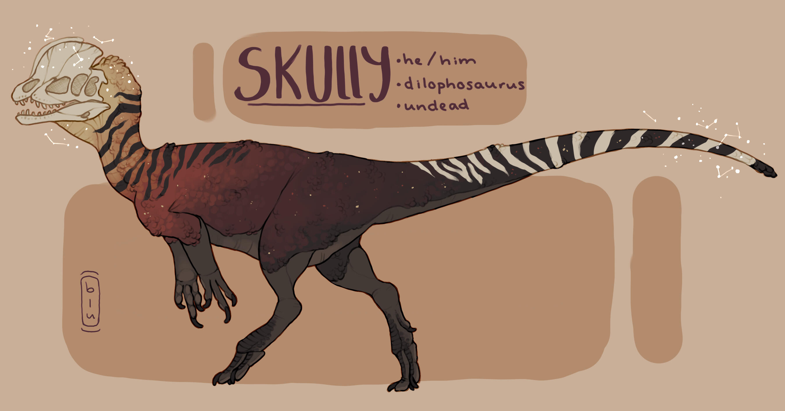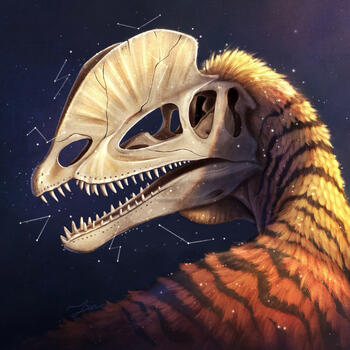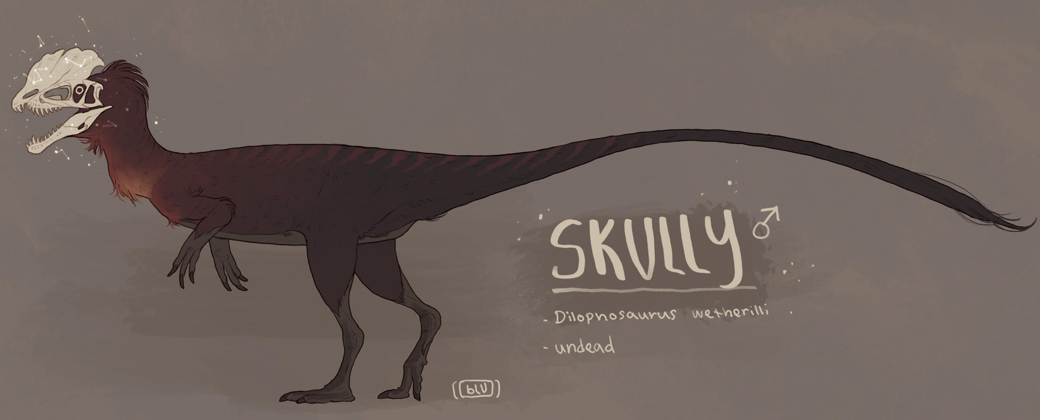 Skully was a large dilophosaurus in the prime of his life, that was alive during the Early Jurassic. He was a very adequate hunter, perfectly evolved to survive in his environment. However, nature is not fair, and when a long and brutal drought struck the entire area he lived in, not even of eons of adaptation could save him. All local plant life withered, and then the prey died, and then the last of the water sources dried up shortly after. Nature seemed to purposefully scorn the dilophosaurus’s desperate attempts to survive at every turn. Once when he was about to plunge into a fresh Sarahsaurus carcass, a wall of dry and crumbling rocky soil fell directly above it, covering the carcass completely and barely missing Skully as he jumped out of the way. Another time, he had found an entire pool of water, only for it to be a hot and bitter sulfur spring that he could not choke down.Skully spent months just barely enduring on the barest of resources, suffering constantly from the pain and fatigue of hunger, plagued by dizziness and hallucinations. At last when there was not even carcasses left to scavenge, his hunger overtook him and he fell into a depression in the ground where a last muddy puddle of water waited to be drank. And once that was gone, he suffered for three more days, his tongue swelling and eyes sinking, until his organs failed and he expired. His contracting and shriveled muscles pulled his body into an eternal arched pose of agony.