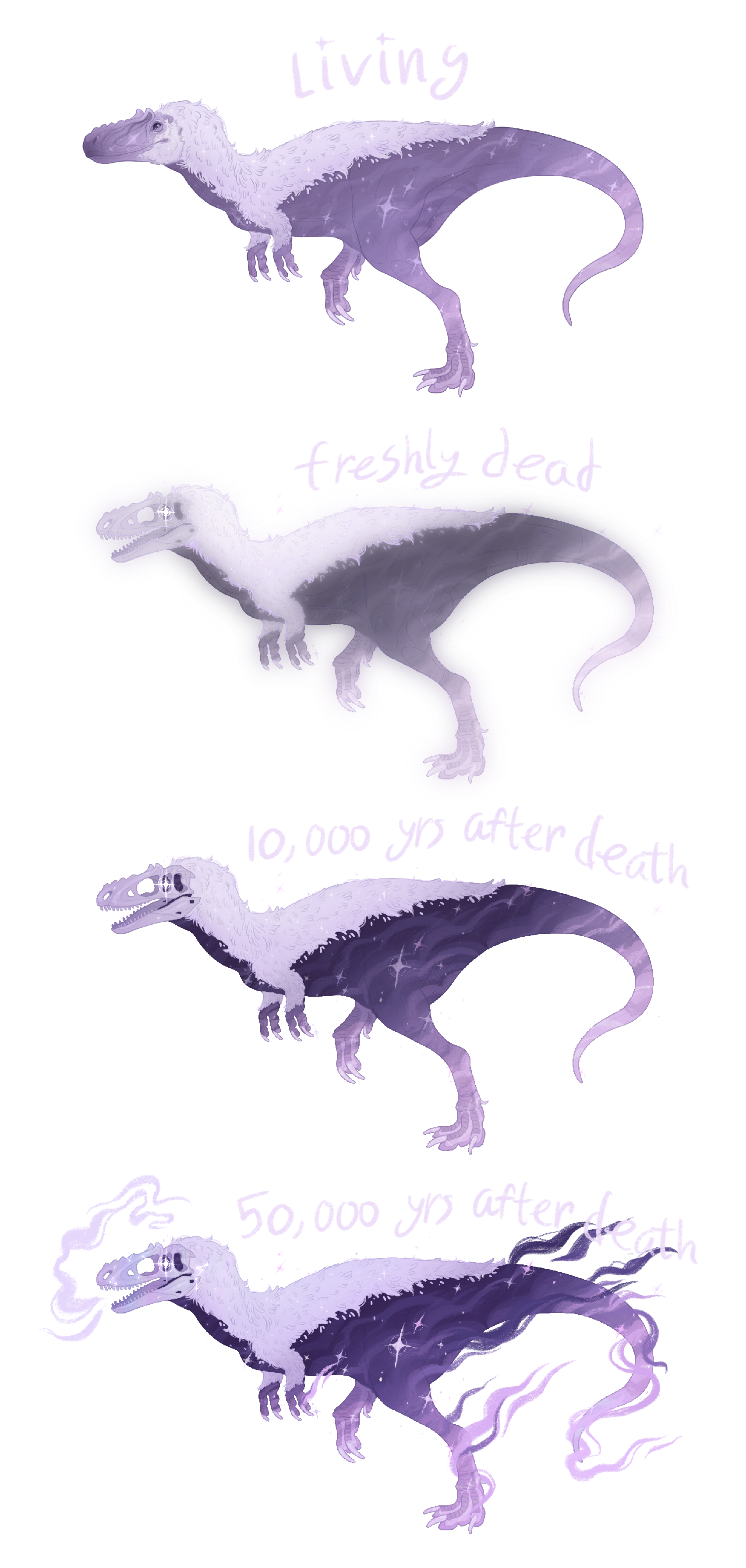 In lore, Paleoghosts gather their essence over time! It takes millions of years for their appearance to finalize, as they either fossilize or connect to things after death. But this is just in lore and no one needs to draw their character this way!