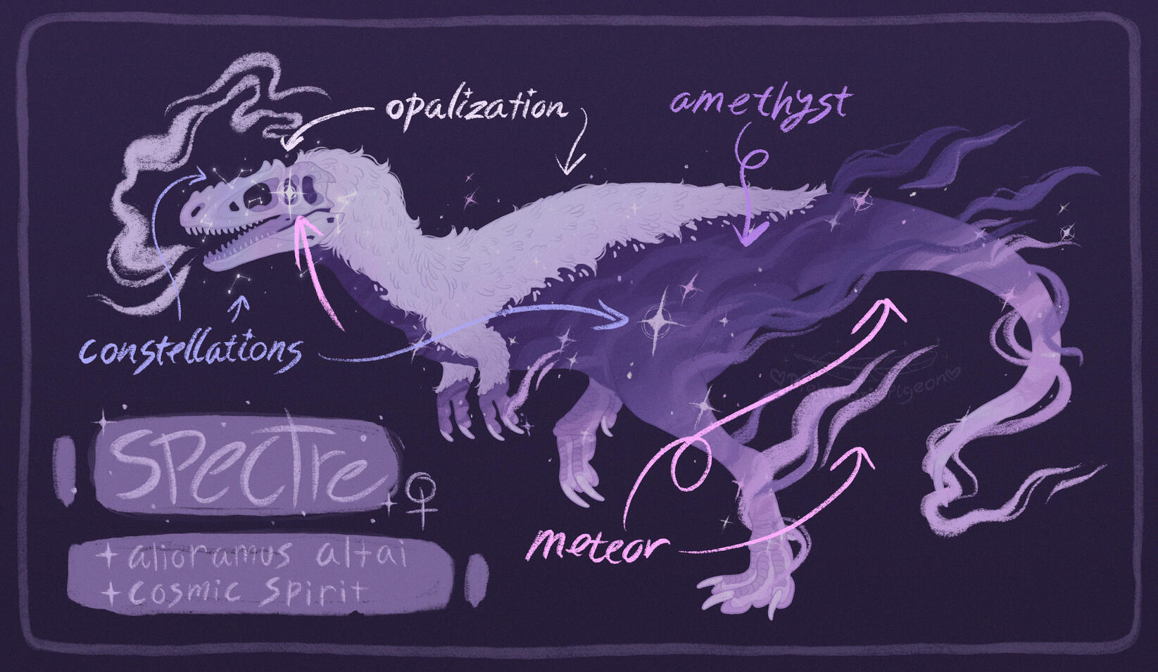 Occasionally she will come across a fossil that has a creature’s spirit still tethered to it with some unfinished business, and will awaken them to join her in her wandering, until their soul is at peace and can pass on.Their own skeleton was covered in silica-rich water and the bones opalized, an amethyst geode eventually forming around them as they fossilized. As she wanders both the cosmos and the earthly plane they are forever bound to it, buried deep in the ground.