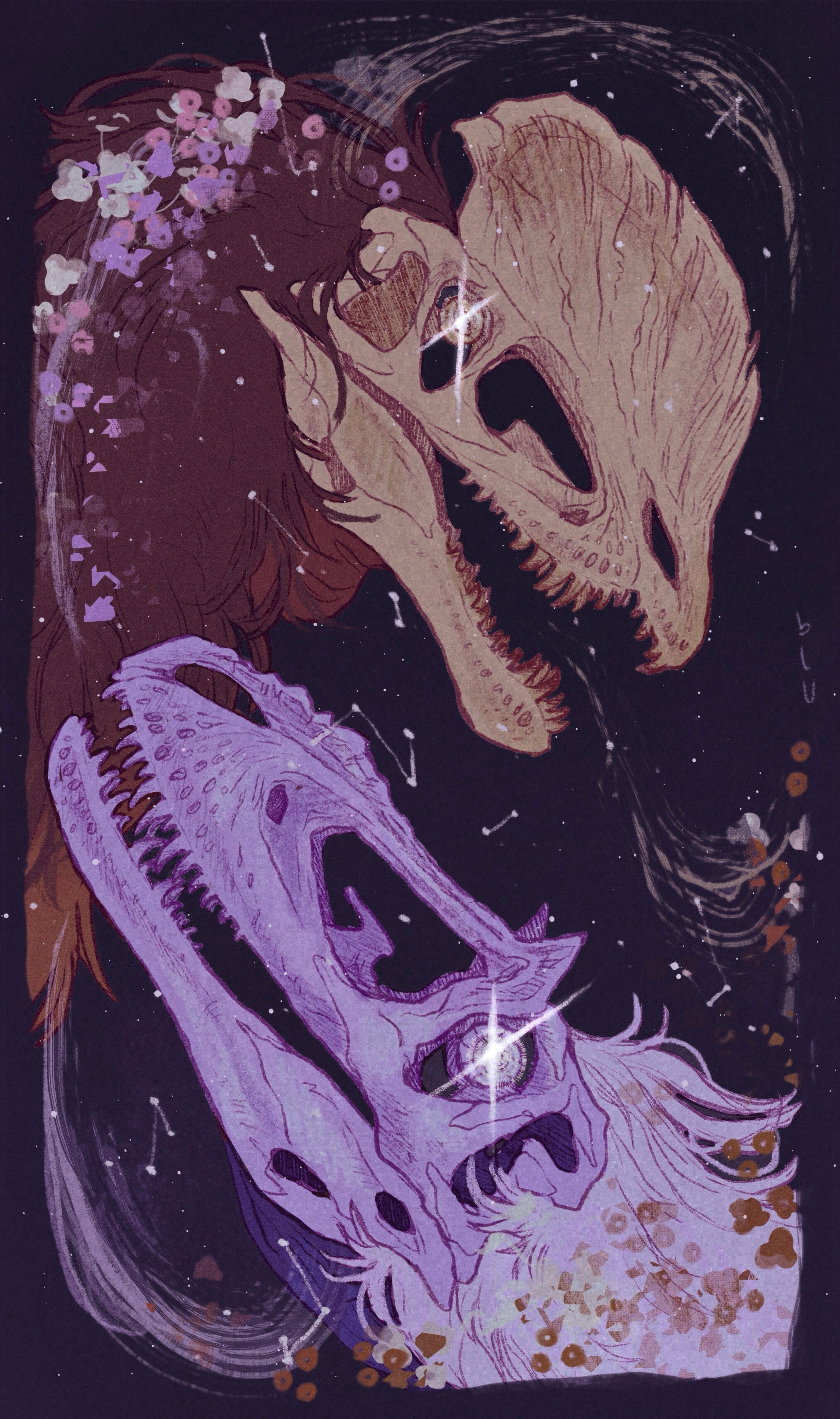 Then, one year, all changed. They came across a fossil that, like them, had a spirit tethered to it still. One that had lived and died long before their time, and still had not departed. They were not awake, and yet not at rest, unable to pass into peaceful darkness until their soul had found the relief it longed for. She woke them, a second spirit, and they became a wanderer as well. Sometimes together, mostly apart, they kept roaming. Another few thousand years passed.Then the first spirit made a mistake, and woke something they should not have. They abandoned it to roam alone, fearful of its hatred, and the thing became a vengeful ghoul, capable of devouring others. But it remained deep in the far cosmos, only venturing towards the Earth every few million years, and then the first spirit and the vengeful spirit fight, a vicious, savage struggle that lasts days before usually ending in a stalemate, both exhausted, the vengeful one retreating back to where it came from.